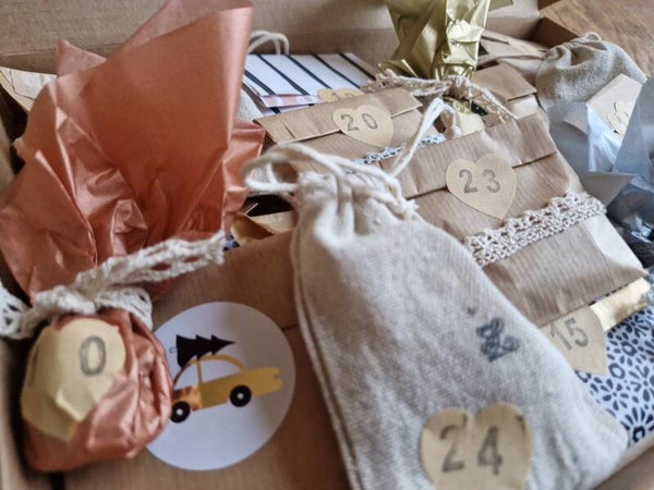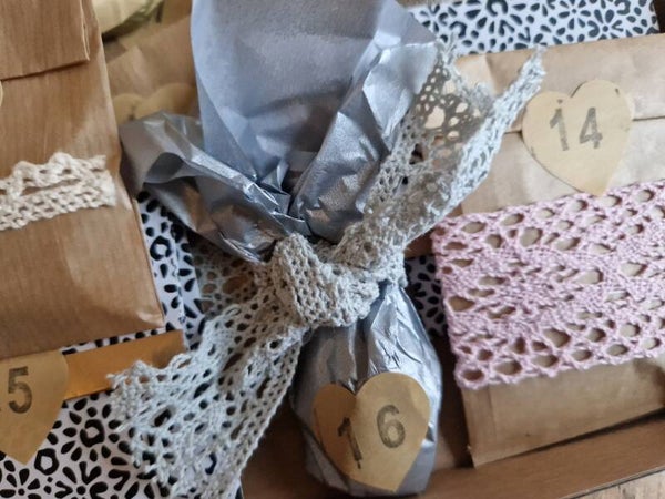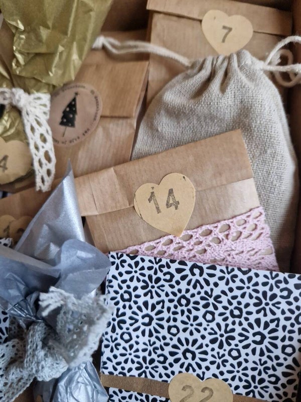Alle cadeautjes worden afzonderlijk leuk verpakt en voorzien van een nummer. Hang het leuk op aan bijvoorbeeld een tak of kledinghanger of kies ervoor om een mooie mand te vullen met cadeaus ♡