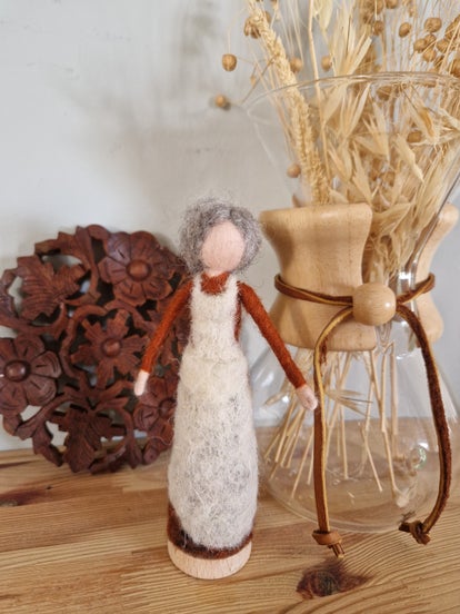 Een prachig handgemaakt engeltje in herfstkleuren, met details van eikeltjes.